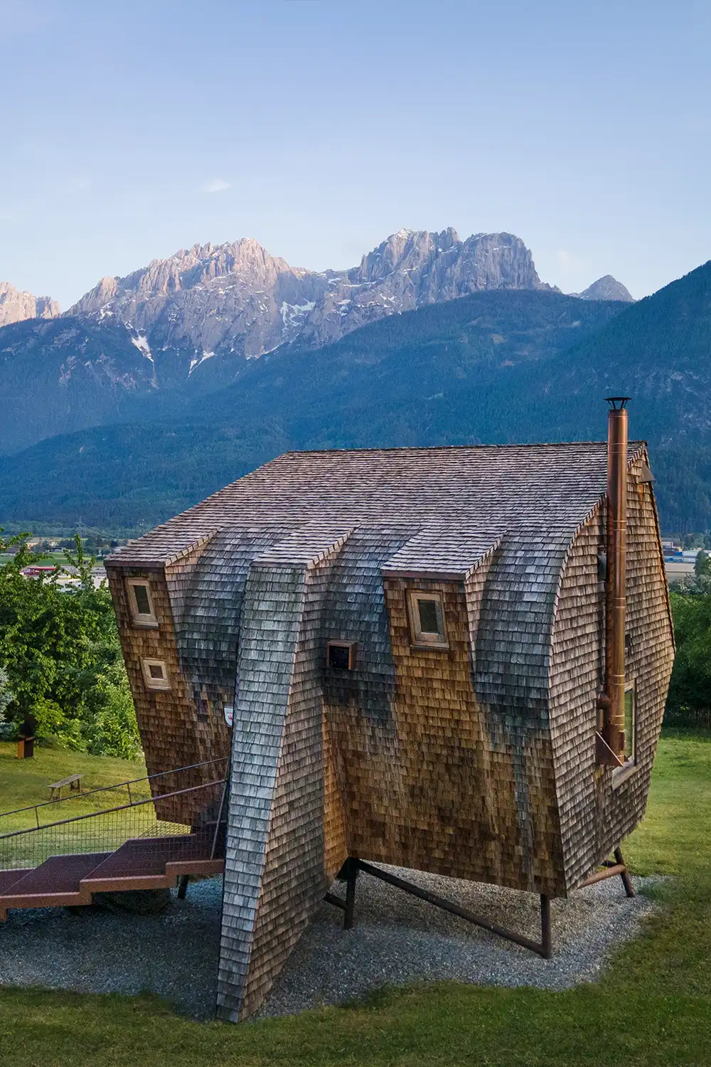 Auf Stelzen gebaut und nur über eine Brücke erreichbar, scheint das Ufogel über der Wiese zu schweben. Diese besondere Konstruktion trennt nicht, sondern verbindet: Haus und Landschaft treten in einen ruhigen Dialog. Große Öffnungen holen die Natur ins Innere, während das Gebäude selbst Teil der Umgebung bleibt.